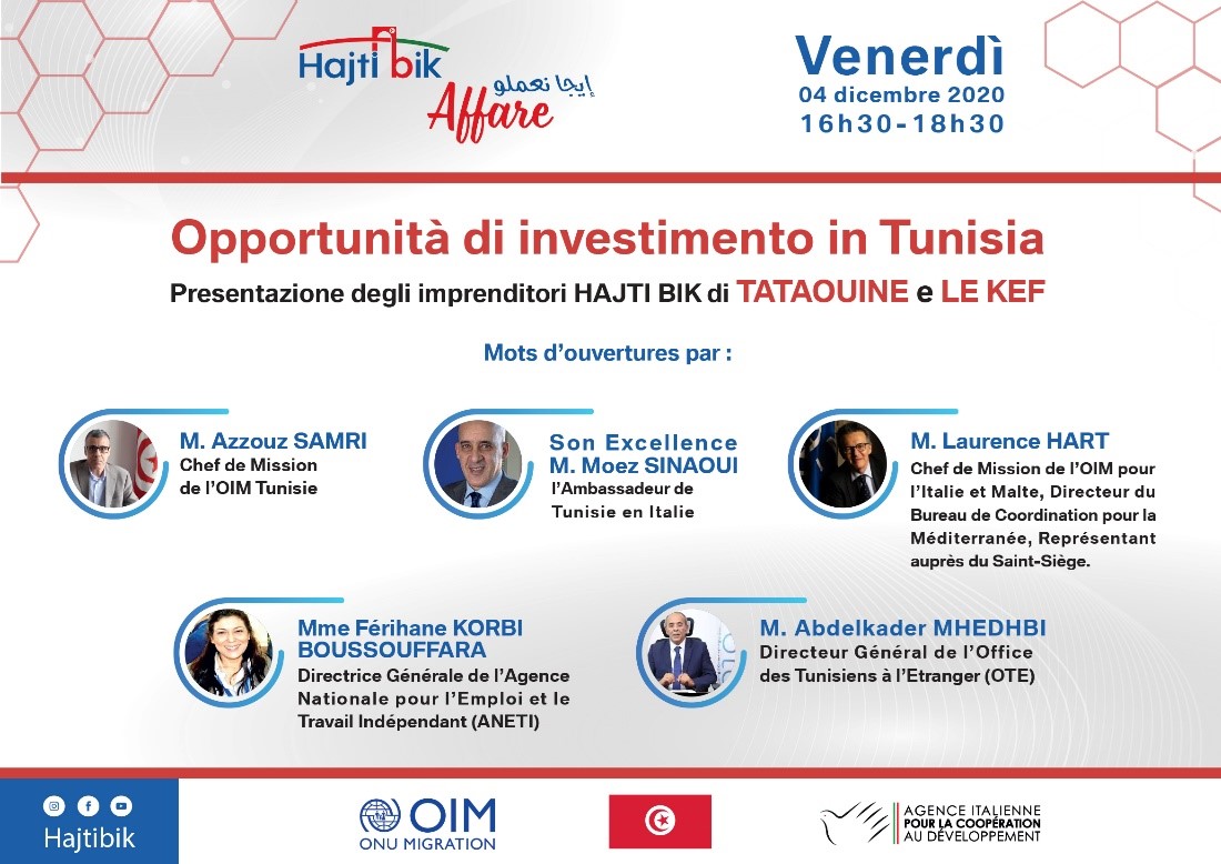Il est nécessaire de rappeler que le programme Mobi-TRE Hajti Bik vise à développer les opportunités d’emploi pour les populations des régions du Nord-Ouest et du Sud-Est de la Tunisie, afin de faire reculer la pauvreté tout en diminuant les risques liés à la migration irrégulière ; et également à promouvoir les investissements de la diaspora tunisienne, plus particulièrement celle établie en Italie, afin de favoriser le développement régional de la Tunisie dans une perspective de coopération transnationale.